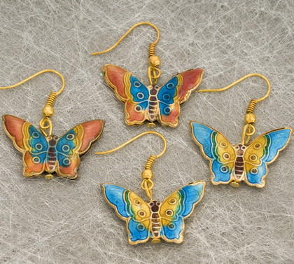 A fashionable pair of decorated earrings, with butterfly design in bronze or blue. Great for parties and everyday wear.