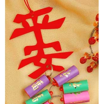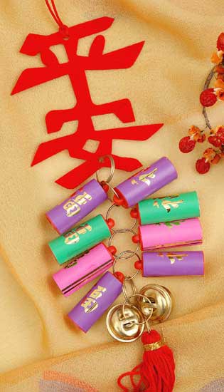 Topped off with red Chinese characters that say "Ping An - Peaceful, Safe and Sound", you'll want to hang this brightly colored firecracker decoration on your door to celebrate the Chinese New Year and welcome in these auspicious wishes (and also wish the same to your guests). Use this beautiful hanging year after year to decorate your home for the Chinese holidays.