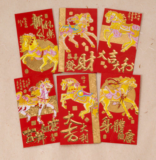 Cheerful and bright, these beautiful red envelopes (also called hongbao) are adorned with horse images and decorated with the Chinese characters of Prosperity, Healthy, Happy New Year, Good Luck, and more.