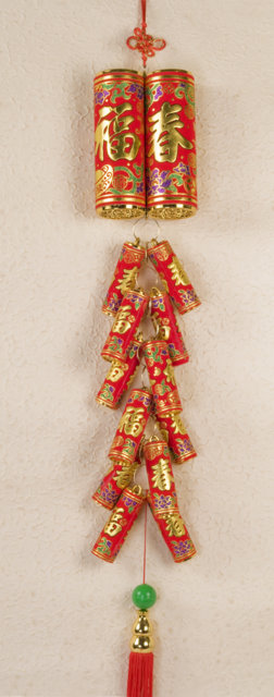 Firecracker wall hangings are a traditional Chinese New Year decoration. Firecrackers are used to scare off evil spirits and misfortune. This firecracker wall hanging comes in two sizes, each of which are topped with a traditional Chinese knot and finished with a tassel. The firecrackers are decorated with the Chinese characters "Chun" -- "Spring" and "Fu" -- "Good Luck" on two sides. Add this decoration to your New Years collection and hang it year after year to brighten your home and spirits for the New Year!