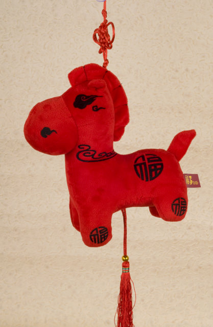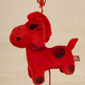Celebrate the Year of the Horse with this darling plush horse ornament. Each horse is red in color, and features embroidered Chinese character "Fu" (Good Luck)) characters. The toy also comes with a suction cup so that you can hang it on any clean surface such as a mirror.