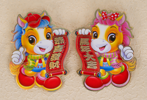 Greet the Year of the Horse by hanging this traditional wall poster in your home or office. The 3-D cut-out horse features embossed "马年大吉,恭喜发财" - "Good Luck and Wish You Wealth" characters to extend best wishes for the New Year. Price is for a set of two posters