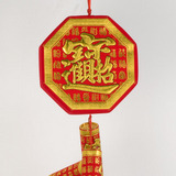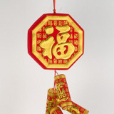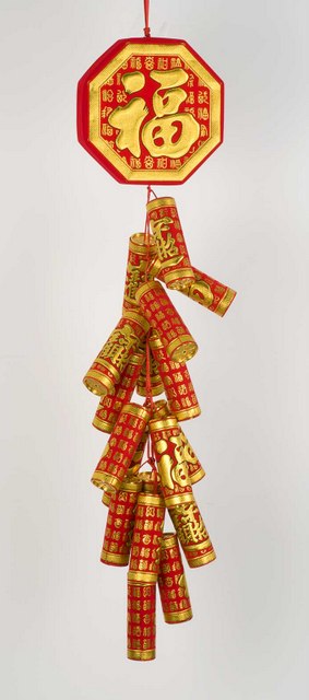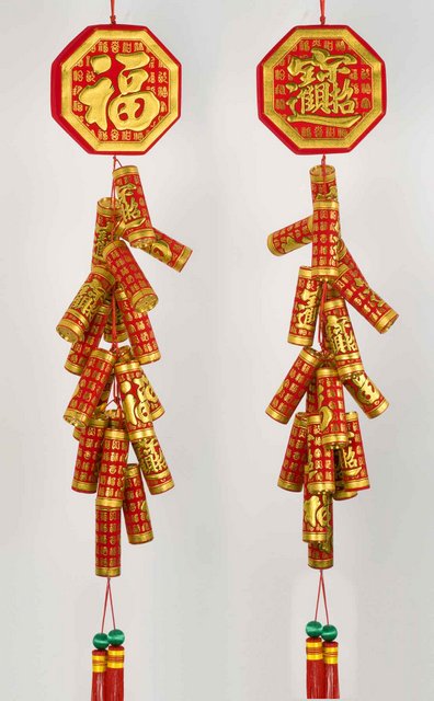 This big firecracker wall hanging is topped with a traditional Chinese knot and finished with a tassel. The firecrackers are decorated with the Chinese characters "Fu" -- "Good Luck", "Zhao Cai Jin Bao"--"Fortune". Add this decoration to your New Years collection and hang it year after year to brighten your home or business and spirits for the New Year!