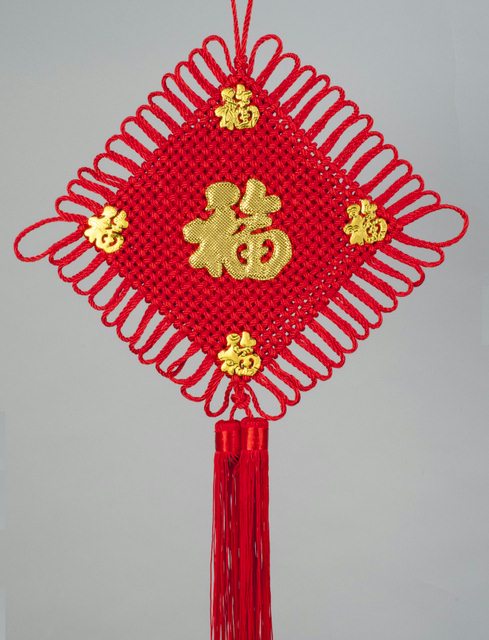 This knotting piece is an essential item in the tradition of festival decorations. The decoration is hung anywhere in homes or businesses to bring in good luck. The character for good luck, 福 (fu), is added to represent the good luck it brings.