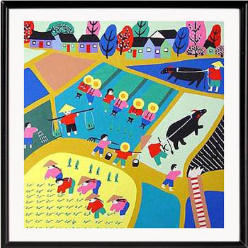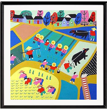 Bright colors and cheerful images abound in this beautiful folk painting that captures a quaint view of life in the countryside, as farmers work in the fields on a sunny day. Charming and elegant, this fine work of original art is sure to brighten your home! Frame is not included in the price.