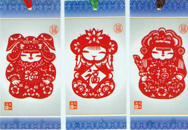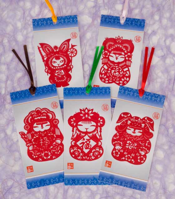 Each of these five papercut bookmarks features a traditional Chinese greeting child holding the Chinese character "Fu" - Good Luck. Each of the girls is dressed in a different outfit and headdress. A unique gift idea for anyone who likes to read.