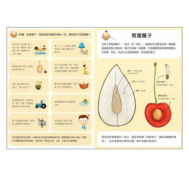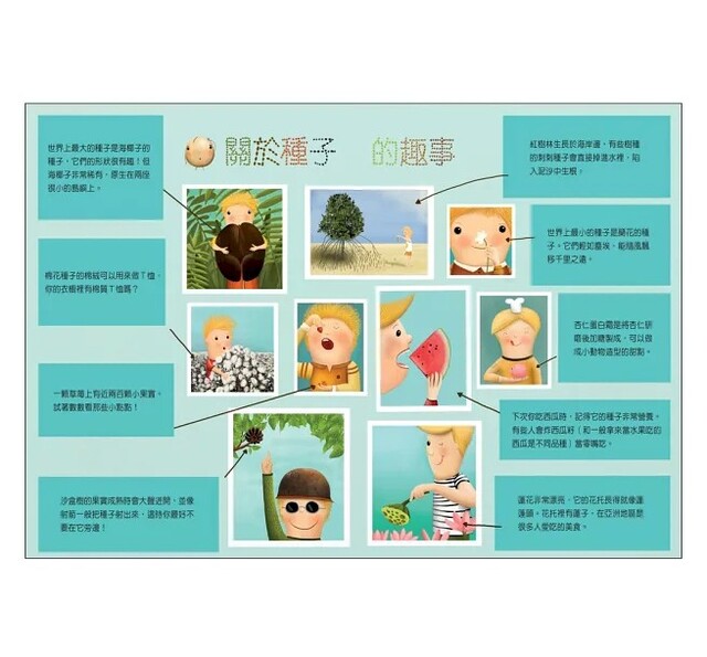 本書《神奇的種子》正是孩子認識種子的最佳嚮導。它披著可愛童趣的稚嫩外衣,一本正經的為孩子介紹種子植物分為被子和裸子兩大類;前一秒嚴肅的告訴你傳播方式對植物來說攸關生死,下一刻又說出「以前有人把堅硬的菱角放在家門地上當作防盜裝置」的趣話,活靈活現的舉例和逗趣說明,讓大小讀者們在歡笑之餘又吸收到滿滿知識。