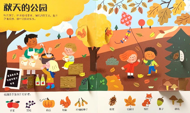 《四季》介绍了春、夏、秋、冬四个季节,每个季节附上典型的场景,比如春天的田野、夏天的海滩、秋天的树林和冬天的画面。在这些场景里,孩子需要找到这个季节典型的风物,比如小鸭子、冰激凌、南瓜、雪人,强化对季节的认识。然后介绍了天气和季节的变化,引导孩子认知,不同的季节、不同的天气,需要有不同的着装,帮孩子认识身边的世界。