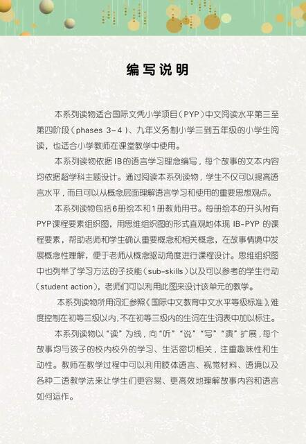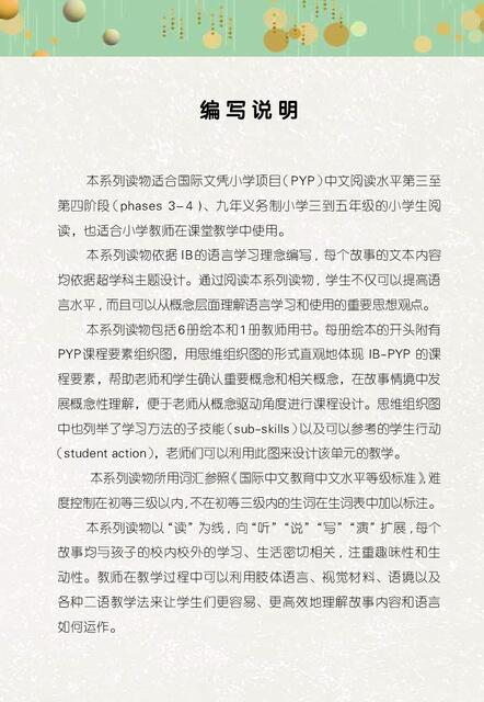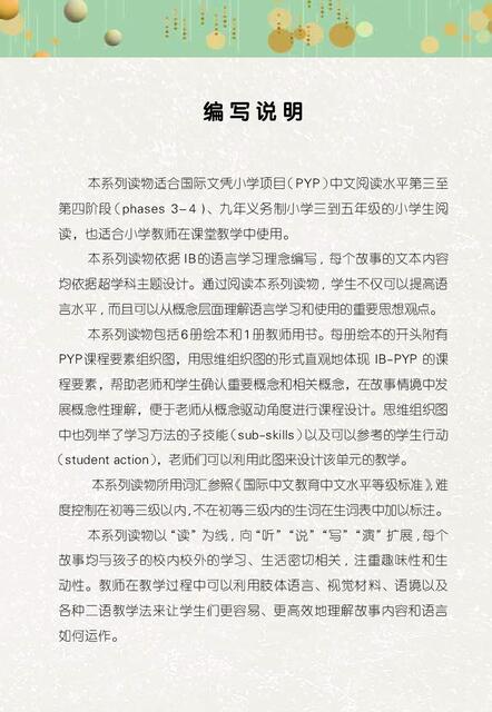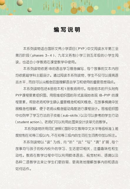 本系列读物依据 IB的语言学习理念编写 ,每个故事的文本内容均依据超学科主题设计。通过阅读本系列读物 ,学生不仅可以提高语言水平, 而且可以从概念层面理解语言学习和使用的重要思想观点。