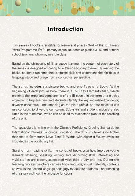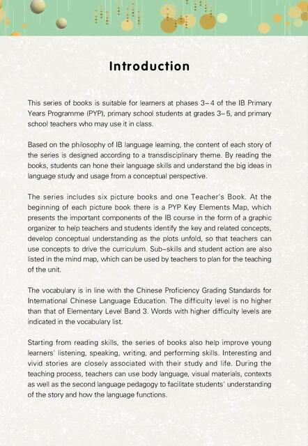 Based on the philosophy of IB language learning, the content of each story of the series is designed according to a transdisciplinary theme. By reading the books, students can hone their language skills and understand the big ideas in language study and usage from a conceptual perspective.