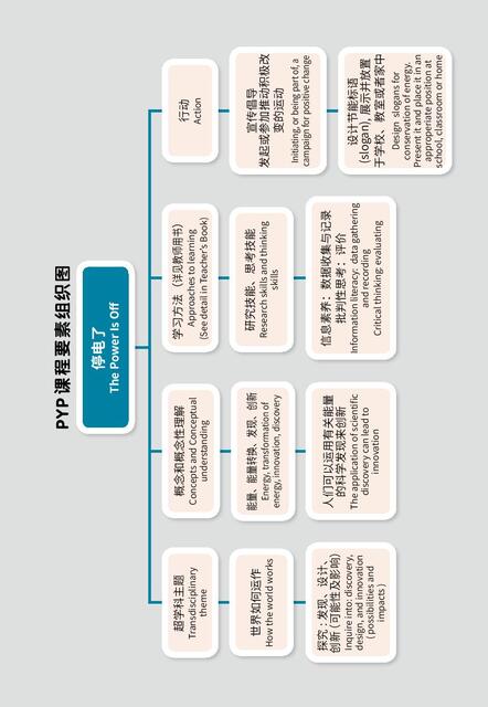 本系列读物包括 6册绘本和 1册教师用书。每册绘本的开头附有PYP课程要素组织图,用思维组织图的形式直观地体现 IB -PYP 的课程要素,帮助老师和学生确认重要概念和相关概念,在故事情境中发展概念性理解,便于老师从概念驱动角度进行课程设计。思维组织图中也列举了学习方法的子技能( sub -skills)以及可以参考的学生行动(student action),老师们可以利用此图来设计该单元的教学。
