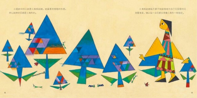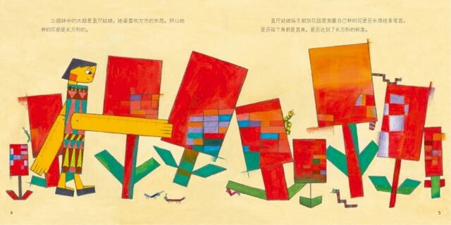 《三姐妹》作者巧妙地将直尺、圆规和三角板化身为三姐妹,将小读者带入一个奇妙的大花园里,为他们讲述了一个引人思考的故事。故事中,大姐直尺、二姐圆规和妹妹三角板各自认为自己种的长方形、圆形和三角形的花是美的,并因此发生了激烈的争执,发展到筑起高墙谁也不肯理谁,结果她们却越来越不快乐。变成蝴蝶的毛毛虫像光一样启发了三姐妹,在它的帮助下,三姐妹认识到“方有方的美,圆有圆的妙,三角形有三角形的俏。多种美丽并存,世界才会更加丰富多彩”。