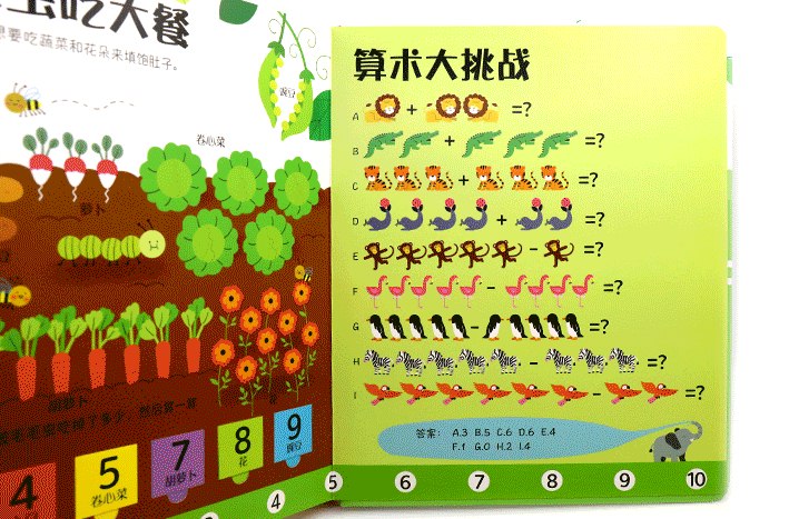 互动性强,让宝宝成就感满满:翻翻页设计,既可以捉迷藏、找不同,又可以对答案、记单词。既锻炼了孩子的手眼协调,也使得阅读体验更加多元有趣。
