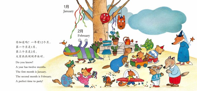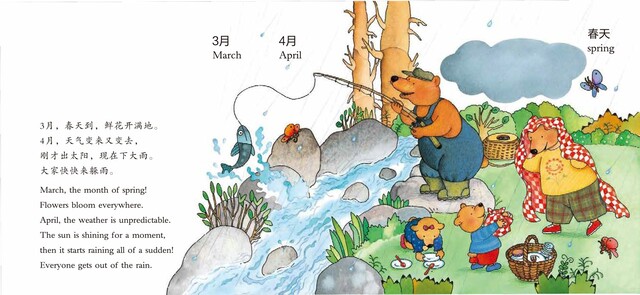 一年12个月 认知季节和月份/双语启蒙/精细动作发育 这是一本季节和月份认知书,适合0-3岁孩子阅读。书中讲述了小熊一家人一年12个月里发生的不同的故事,比如去摘樱桃、去海边玩、全家播种等,让孩子了解春夏秋冬每个季节的特点,学习月份、季节相关的知识。全书语言生动有趣,读来朗朗上口,节奏感强,中英双语的内容设计,让孩子在不知不觉中完成英文启蒙。插画色彩鲜艳,笔触灵动活泼。书中形状各异的洞洞,专为手指敏感期的宝宝的设计,戳一戳、抠一抠,锻炼宝宝的手指灵活性,激发精细动作发育。