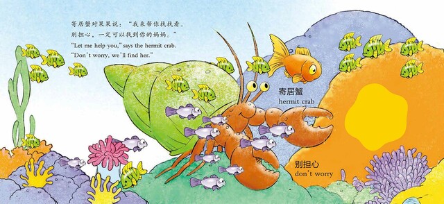 小鱼儿找妈妈 提高阅读力/双语启蒙/精细动作发育 这是一本适合0-3岁海洋动物认知书。小鱼儿果果找不到妈妈了,和海龟、寄居蟹等海洋动物们一起帮果果找妈妈吧!中英双语启蒙外语认知,形状各异的洞洞,专为手指敏感期的宝宝的设计,戳戳抠抠,锻炼宝宝精细动作发育。插画色彩鲜艳,笔触灵动活泼。书中形状各异的洞洞,专为手指敏感期的宝宝的设计,戳一戳、抠一抠,锻炼宝宝的手指灵活性,激发精细动作发育。