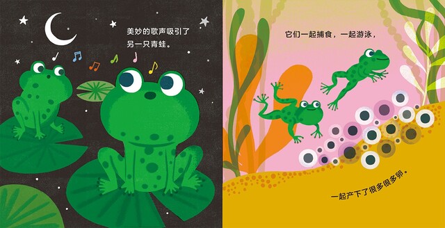 小蝌蚪长出后肢,再长出前肢,变成了幼蛙;幼蛙长呀长,长成了真正成熟的青蛙,青蛙生出青蛙卵,青蛙卵在水中漂着漂着,又变成了小蝌蚪……在这本生命教育故事书里,小朋友们将跟随小蝌蚪的脚步,去体验从一颗小小的卵,变成青蛙的神奇历程。还可以通过触摸好玩的洞洞,感受同一个图形,在不同场景下的神奇变化。
