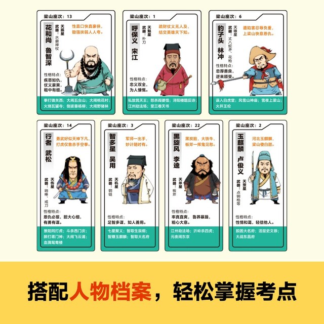 汇总《三国演义》名场面,三国典故忘不掉!桃园结义、温酒斩华雄、三顾茅庐、草船借箭、过五关斩六将……专治没耐心读《红楼梦》!捋清了《红楼梦》的人物关系和故事脉络——贾氏公司咋破产的,宝黛爱情咋悲剧的?孙悟空的取经路,就是孩子从淘气叛逆到勇于担当的成长路!《西游记》取经路上的打怪故事,故事背后的成长道理。七个好汉是核心,人物故事全厘清!记住七个核心好汉的性格和情节,就能串起《水浒传》全部人物和故事!
