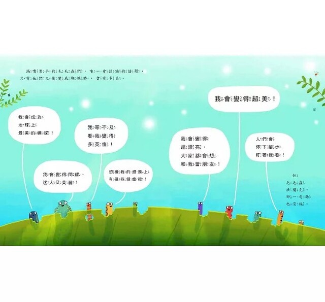 期待化蛹成蝶的毛毛蟲們,每天都在想像自己未來的美麗樣貌:有的想要漂亮的斑點,有的想要亮眼的花紋。終於,蝴蝶們脫蛹而出,卻發現自己長得跟原來的想像截然不同,他們都覺得自己不夠美……只有一隻叫法蘭克的蝴蝶,比誰都還要喜歡自己的樣子!