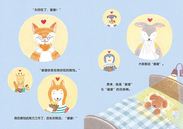 小狗泰迪看到了一个非常喜欢的玩具,却没有钱买。他这里找找,那里翻翻,可是,到处都找不到钱。最后,他来到了一家面包店,帮这里的老板看店,得到了报酬,并在这个过程中学会了买了东西说“谢谢”,卖了东西说“谢谢”,感受到了钱是一种与谢谢交换的东西。