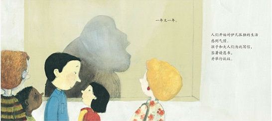 对于那些热爱纽伯瑞获奖作品(2012)的人来说,艾波盖特创造了一本由真实故事改编而成的图画书。一只来自非洲中部的幼猩猩被抓获,并被带到了塔科马,华盛顿。最初,他生活在一个人类家庭里,和孩子们一样快乐的生活,在床上睡觉,去看棒球赛,吃冰淇淋。但当伊凡长得太大之后,他被卖掉了,27年以来,这只成年银背大猩猩生活在一个购物中心的笼子里。后来,抗议的市民写请愿书,使得伊凡去了一个更好的环境——亚特兰大动物园。书后附有更多关于伊凡的事迹和照片,登陆网站可以了解更多信息,还有一张伊凡用手指“签名”的手指画。卡拉斯用铅笔线条和水彩颜料饱含感情地描绘了伊凡温柔可爱的个性和这只温和的大猩猩如何赢得了成千上万人们和读者们的心。