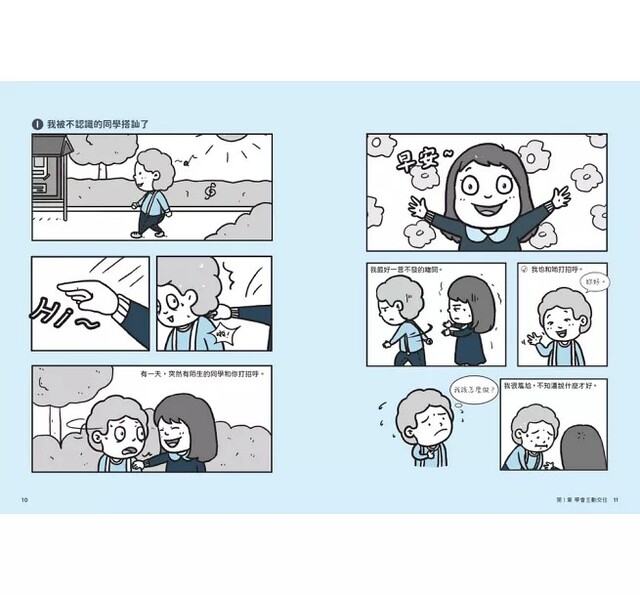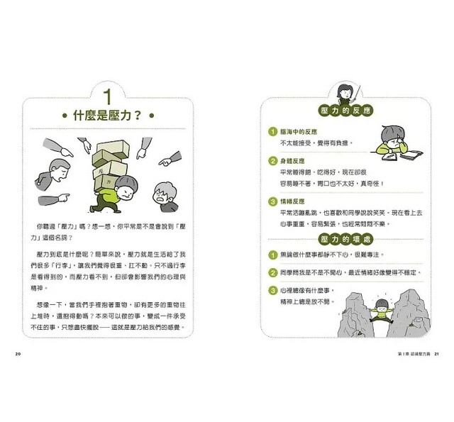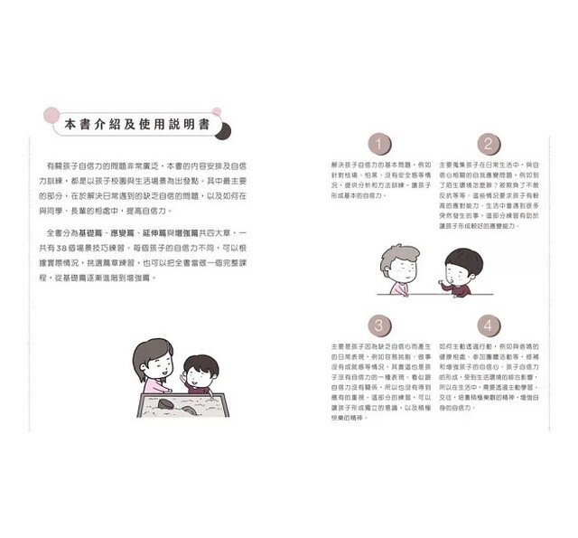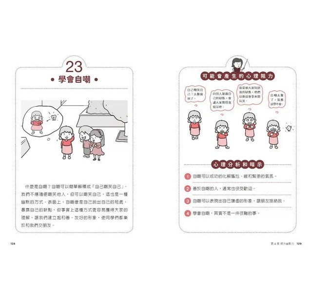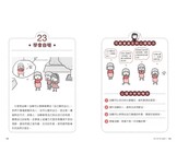 每一章開頭從趣味漫畫場景切入問題,使讀者融入情境一同思考,抉擇如何應對;每篇的實例練習,搭配可愛插圖輔助說明。井然有序的版面視覺動線,與淺顯的語言,引導讀者清楚理解內容,可愛角色點綴其中,如同朋友或師長一樣在旁溫馨陪伴。