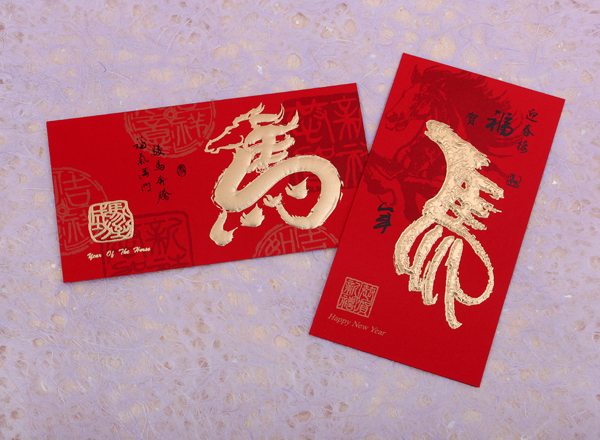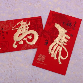Each of these beautiful cards features a stylized depiction of the Chinese character Ma - Horse. The character blends the elegance of calligraphy with a graphic depiction of a horse to create a unique image that celebrates The Year of the Horse. Seals and greetings for the new year accompany the golden horses. Envelope included.